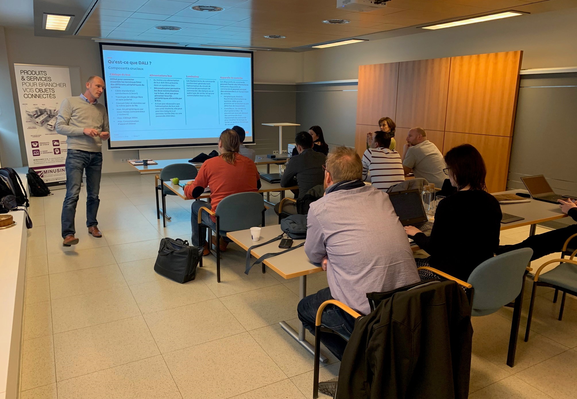 Dieter Coasert, Anca Spatariu et Cristina Clichici d’ABB se sont rendus chez Minusines dans le cadre d’une journée de formation divisée en deux séances (matin et après-midi) et qui s’adressait aux clients de Minusines. Après avoir présenté les généralités sur DALI, les formateurs se sont concentrés sur d’autres points plus précis: l’option DALI avec passerelle KNX, l’option DALI stand-alone avec DCI, les normes en éclairage de sécurité avec DALI et les éclairages de secours Van Lien qui fonctionnent avec DALI.