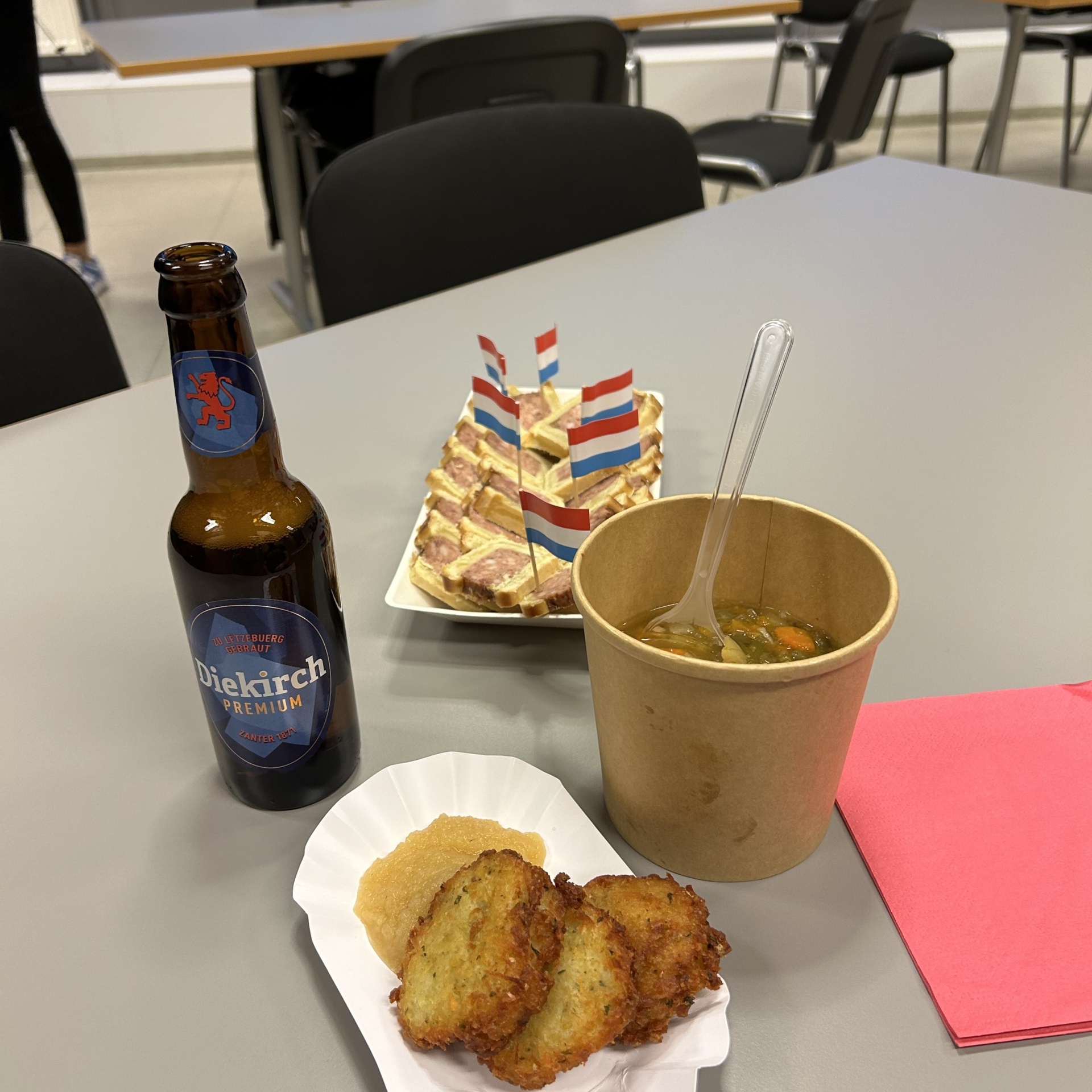 Avec des plats traditionnels luxembourgeois comme le Bouneschlupp et le Gromperekichelcher, accompagnés de délicieuses boissons, nous avons profité ensemble d’une merveilleuse soirée pleine de bonnes discussions et d’une ambiance exubérante.