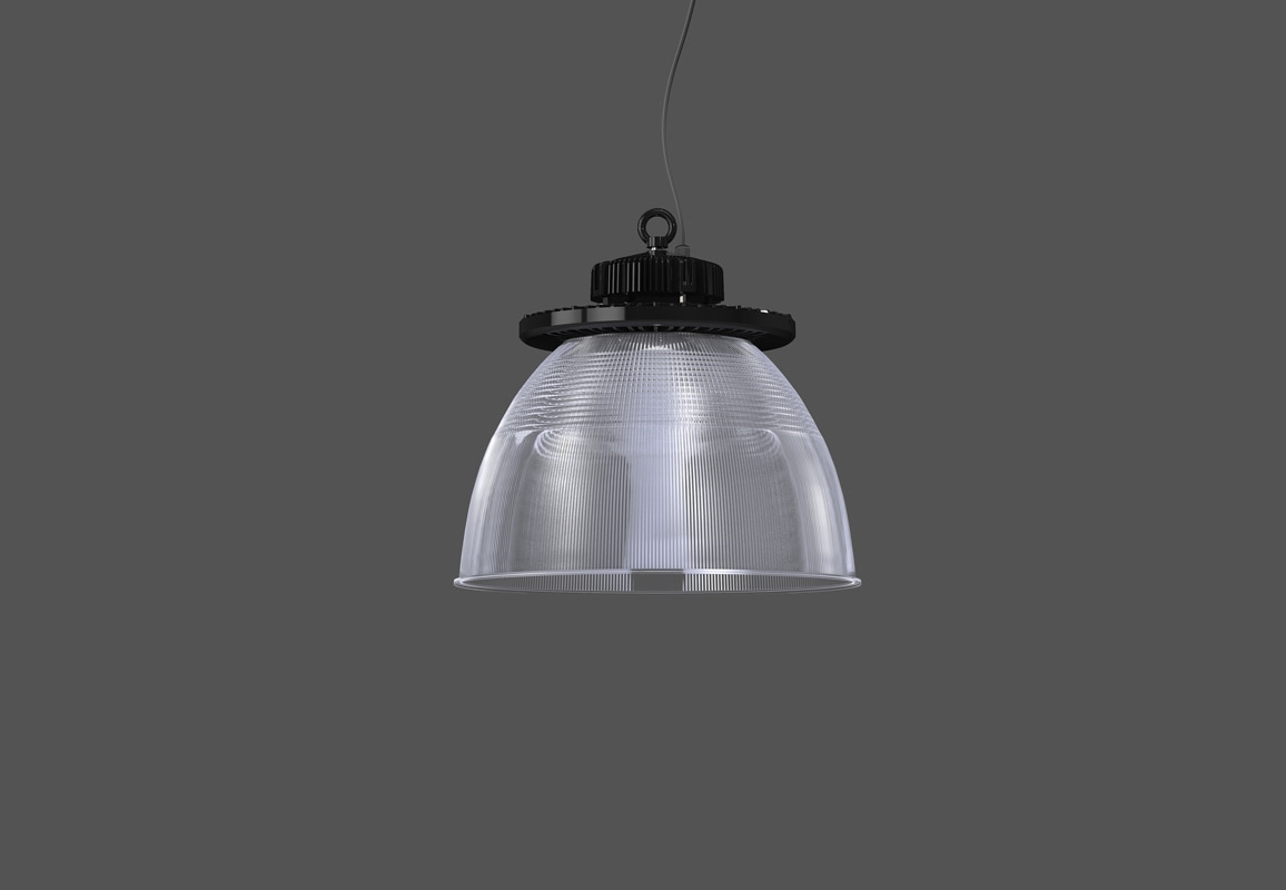 Le luminaire choisi répondait aux exigences du client. Celui-ci est en suspension et en forme de cloche. Son étanchéité est certifiée IP65 ce qui était indispensable au vu de l’environnement dans lequel il a finalement été placé. Il possède également un réfracteur prismatique et transparent et est à la pointe de la technologie LED.