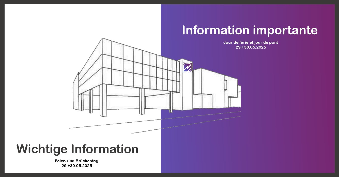 Notre entreprise sera fermée le jeudi 29 mai 2025 en raison du jour férié. Nous ferons également le pont le vendredi 30 mai 2025.